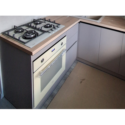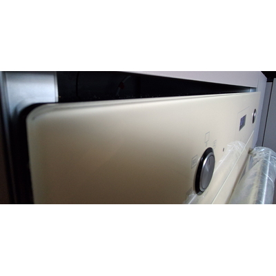 Внимание заслуживает дизайн духового шкафа, ведь фасадная часть она выполнена из стекла в необычном кремовом цвете. При этом две ручки управления и ручка дверцы – серебряного цвета. Ручка дверцы и ручки управления имеют круглую форму. Между ручками реализован цифровой дисплей с сенсорным управлением. Такое сочетание кремового и вставок из нержавеющей стали делает модель современной, стильной и лучшим решением для кухни в современном стиле.